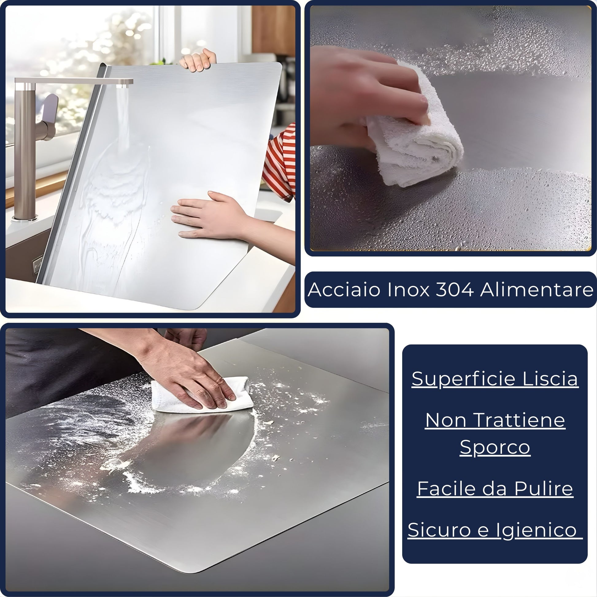 A differenza dei taglieri tradizionali che assorbono macchie e batteri, l'acciaio inox rimane sempre pulito. Basta sciacquarlo sotto l'acqua o passare un panno per farlo tornare come nuovo.